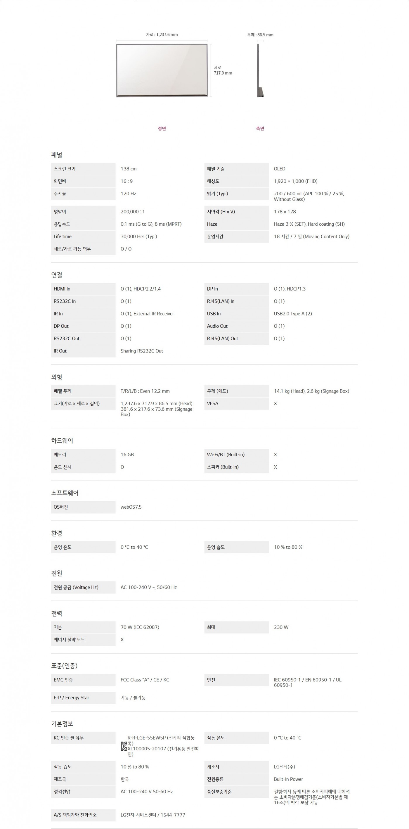 스크린 크기 : 138 cm