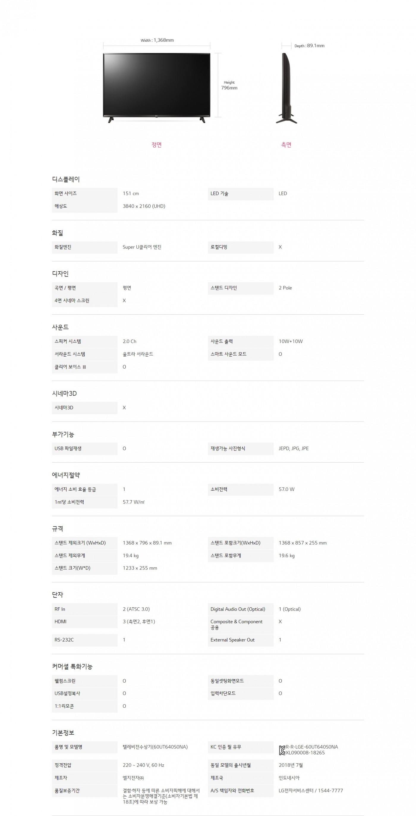화면 사이즈 : 151 cm