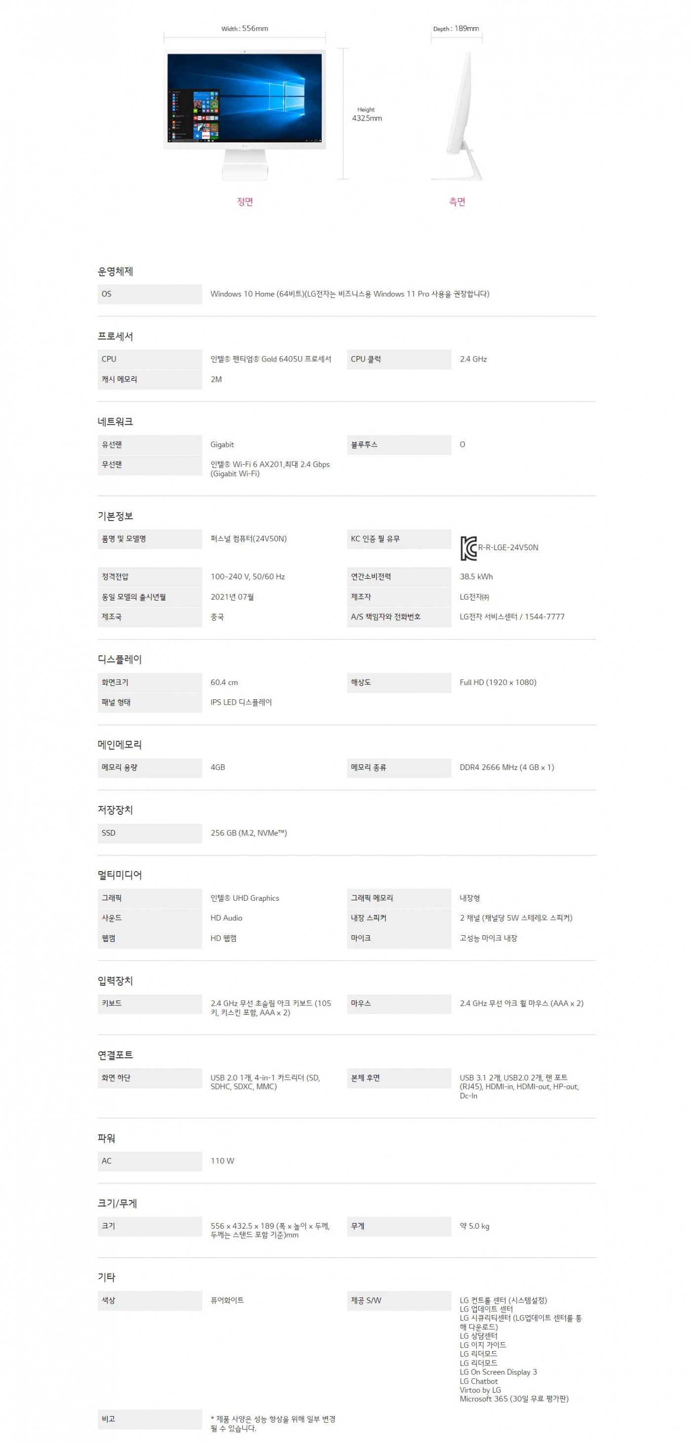 OS : Windows 10 Home (64비트)(LG전자는 비즈니스용 Windows 11 Pro 사용을 권장합니다)CPU : 인텔® 펜티엄® Gold 6405U 프로세서