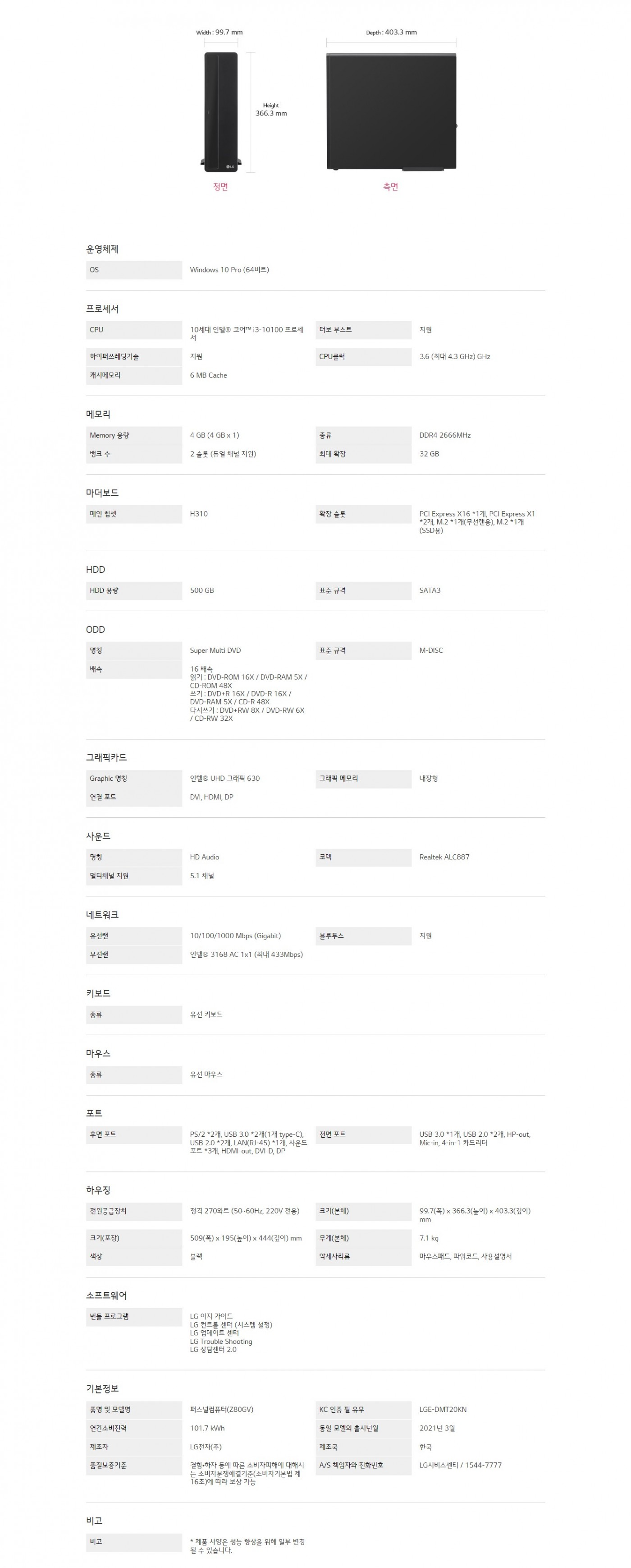 CPU : 10세대 인텔® 코어™ i3-10100 프로세서OS : Windows 10 Pro (64비트)Graphic 명칭 : 인텔® UHD 그래픽 630Memory 용