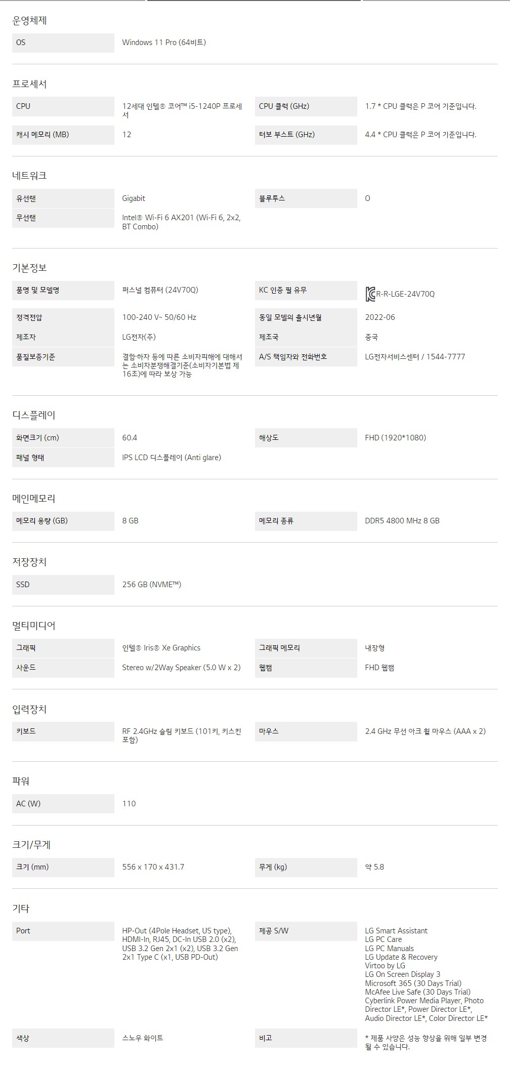 OS : Windows 11 Pro (64비트)CPU : 12세대 인텔® 코어™ i5-1240P 프로세서SSD : 256 GB (NVME™)