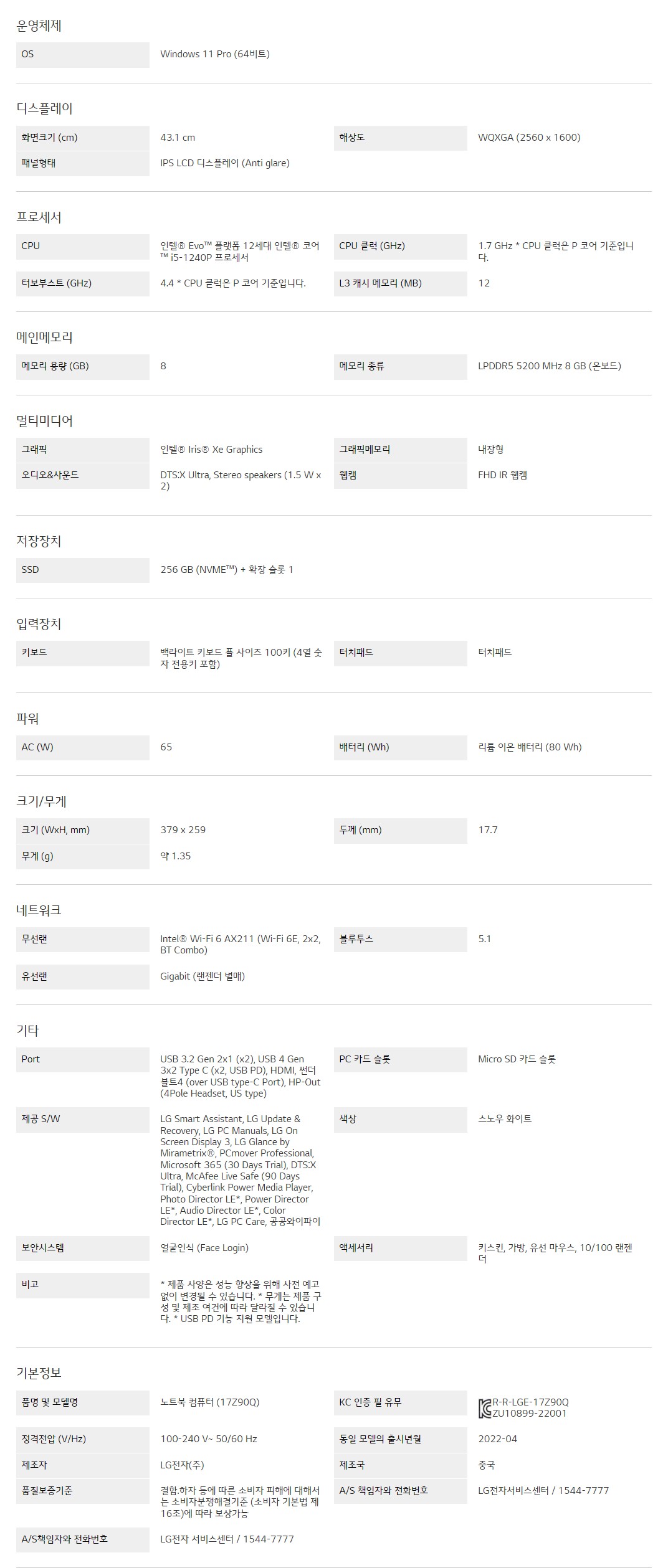 화면크기 (cm) : 43.1 cmCPU : 인텔® Evo™ 플랫폼 12세대 인텔® 코어™ i5-1240P 프로세서메모리 용량 (GB) : 8
