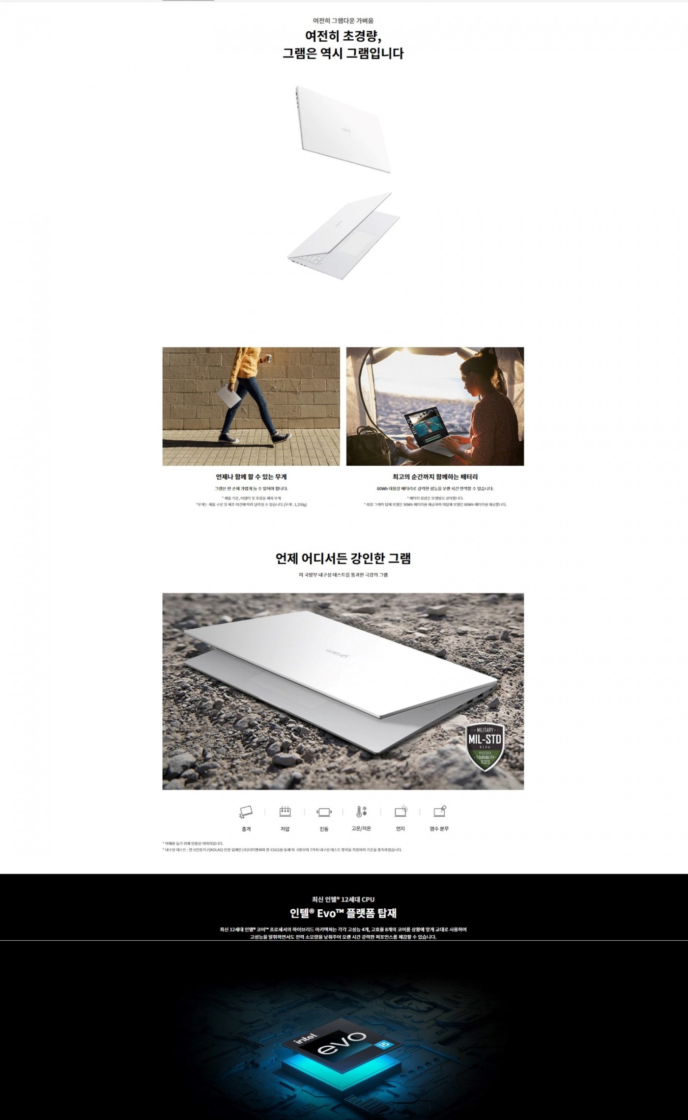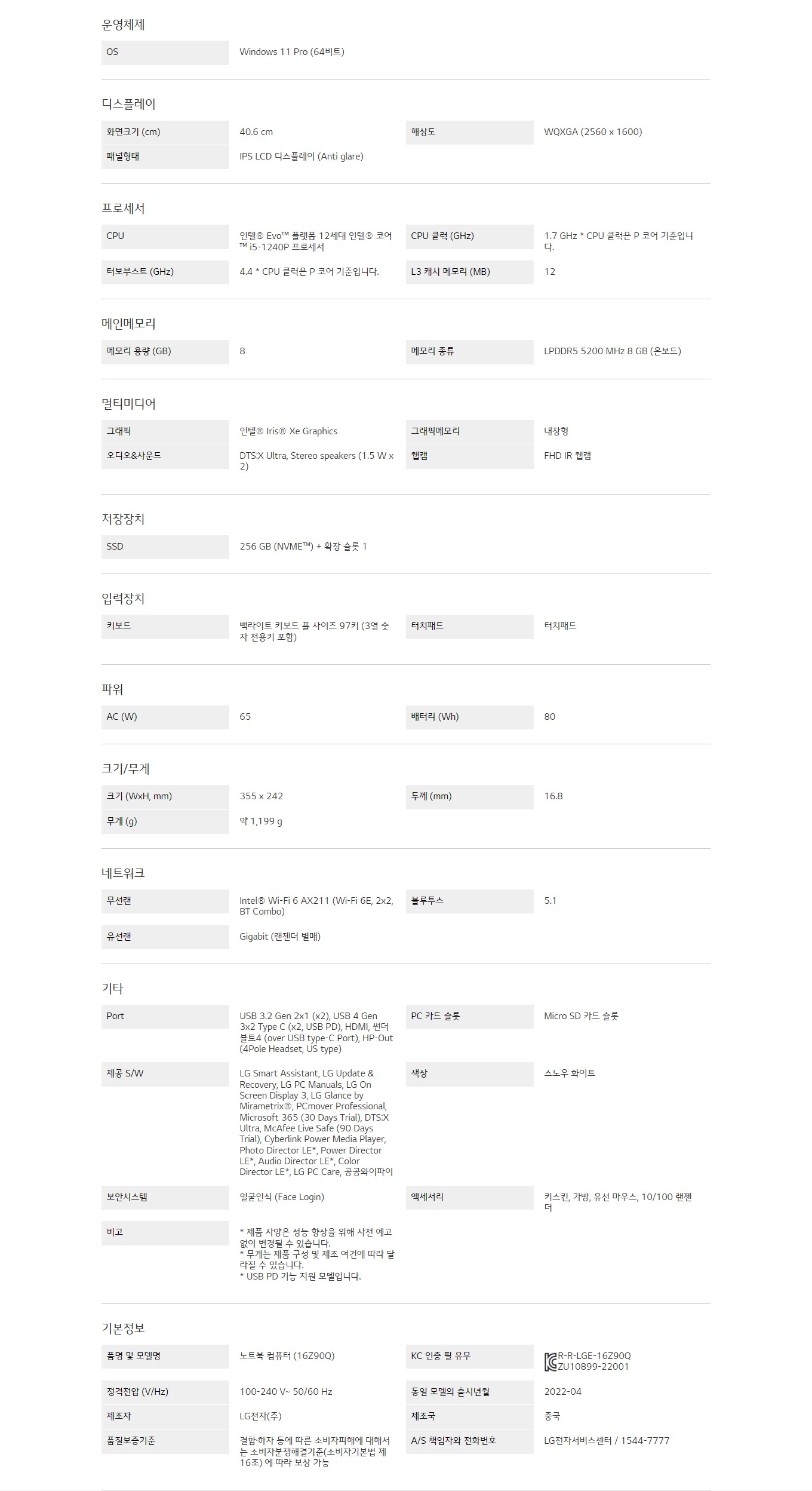 화면크기 (cm) : 40.6cmCPU : 인텔® Evo™ 플랫폼 12세대 인텔® 코어™ i5-1240P 프로세서메모리 용량 (GB) : 8