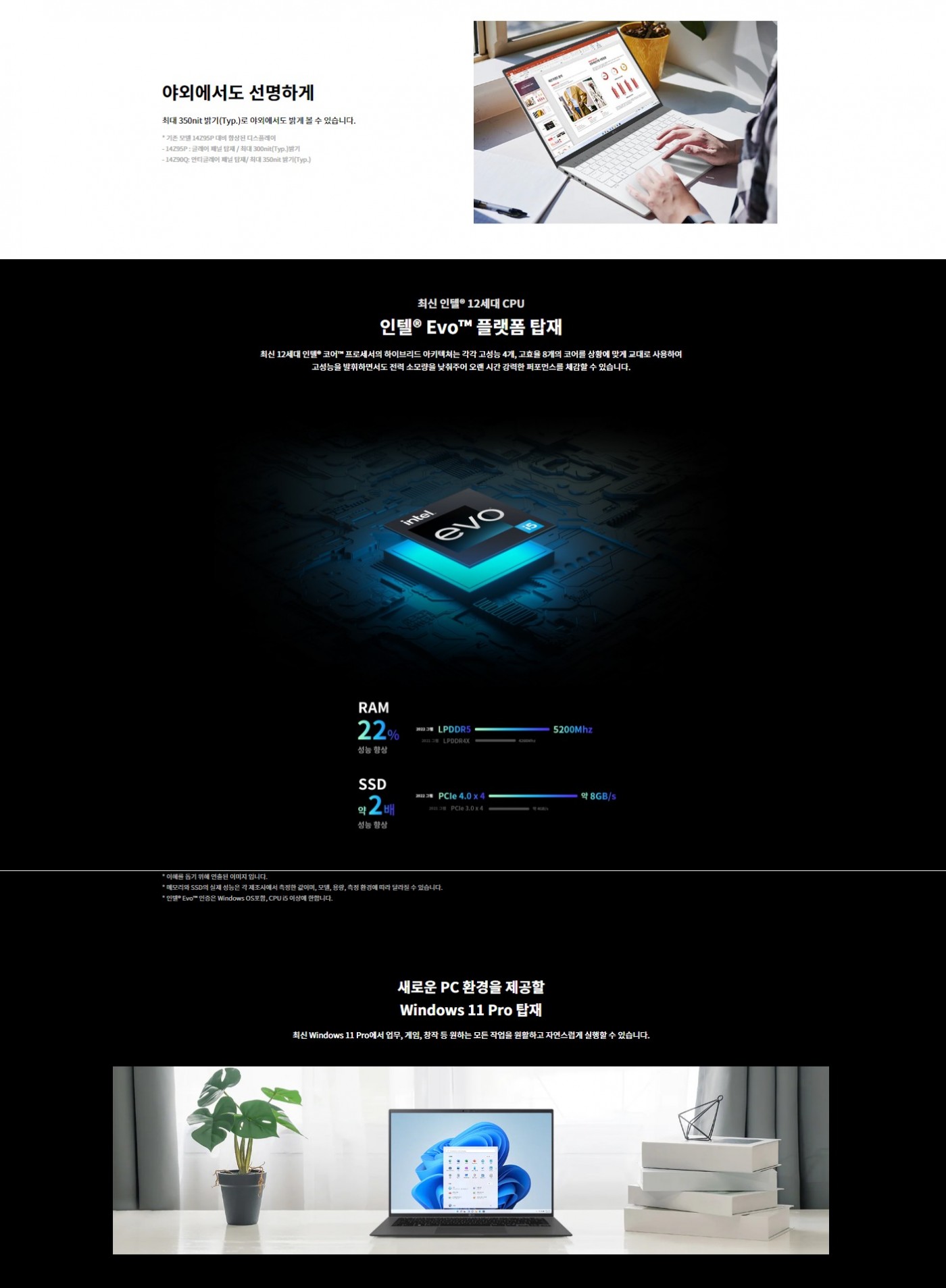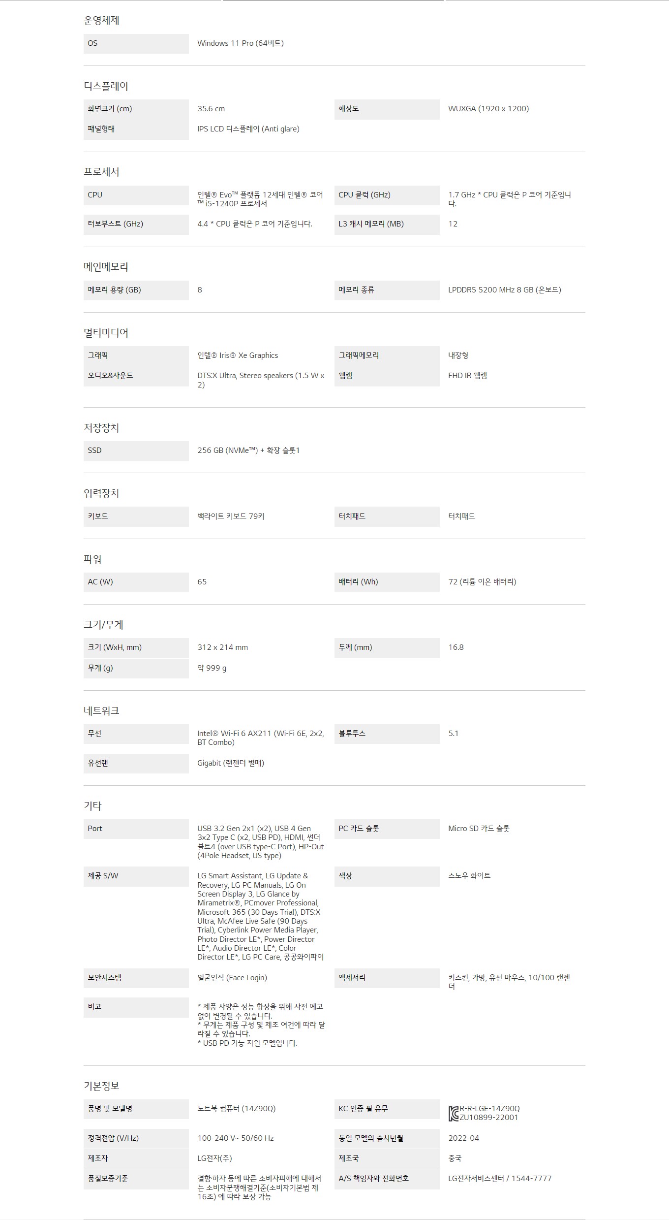화면크기 (cm) : 35.6 cmCPU : 인텔® Evo™ 플랫폼 12세대 인텔® 코어™ i5-1240P 프로세서메모리 용량 (GB) : 8무게 (g) : 약 999