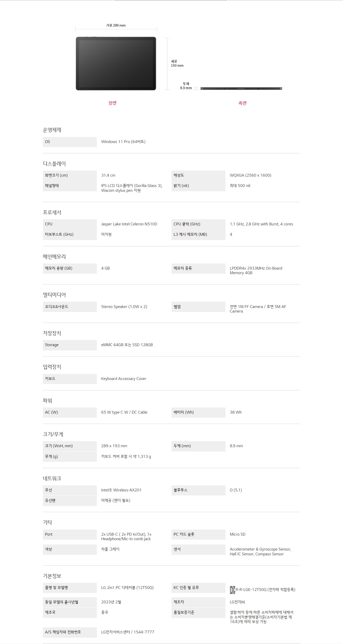 화면크기 (cm) : 31.4 cmCPU : Jasper Lake Intel Celeron N5100메모리 용량 (GB) : 4 GB