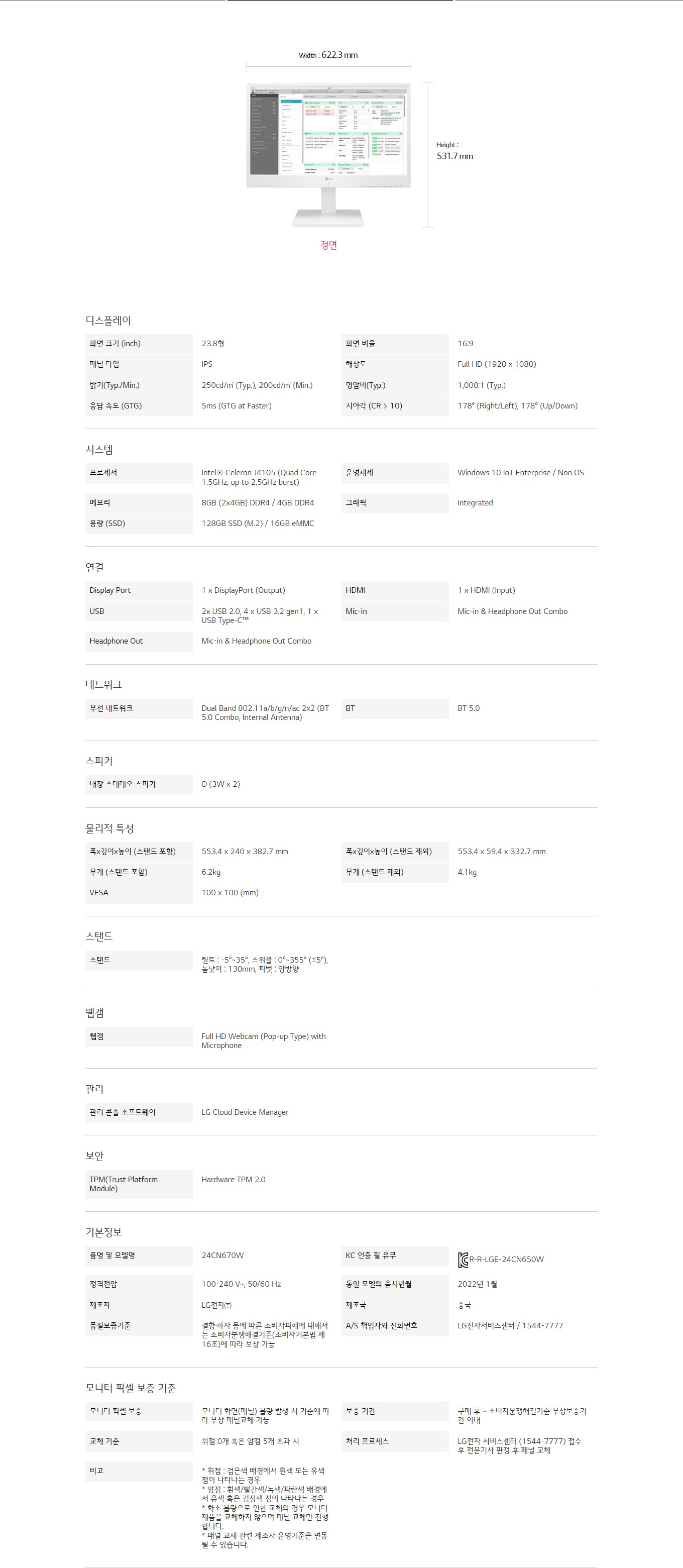 화면 크기 (inch) : 23.8형해상도 : Full HD (1920 x 1080)메모리 : 8GB (2x4GB) DDR4 / 4GB DDR4용량 (SSD) : 128