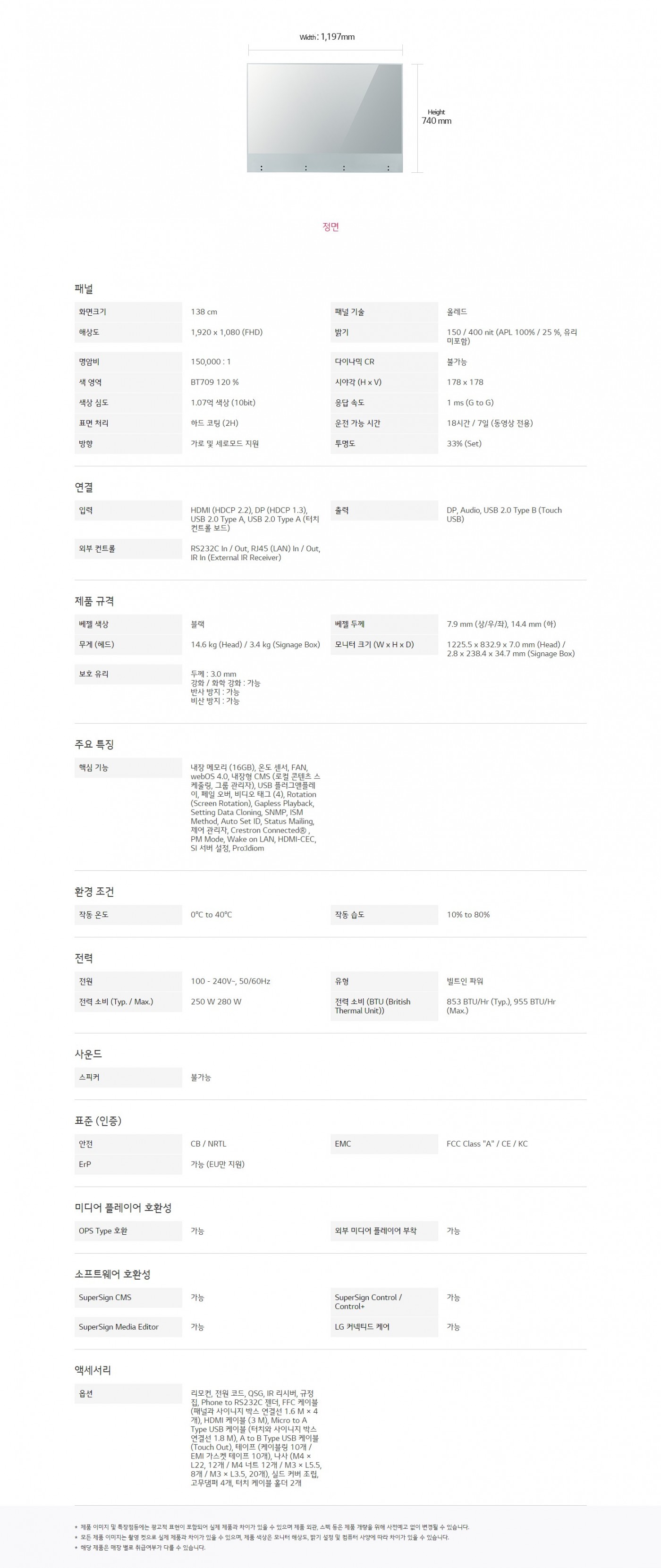 밝기 : 150 / 400 nit (APL 100% / 25 %, 유리 미포함)