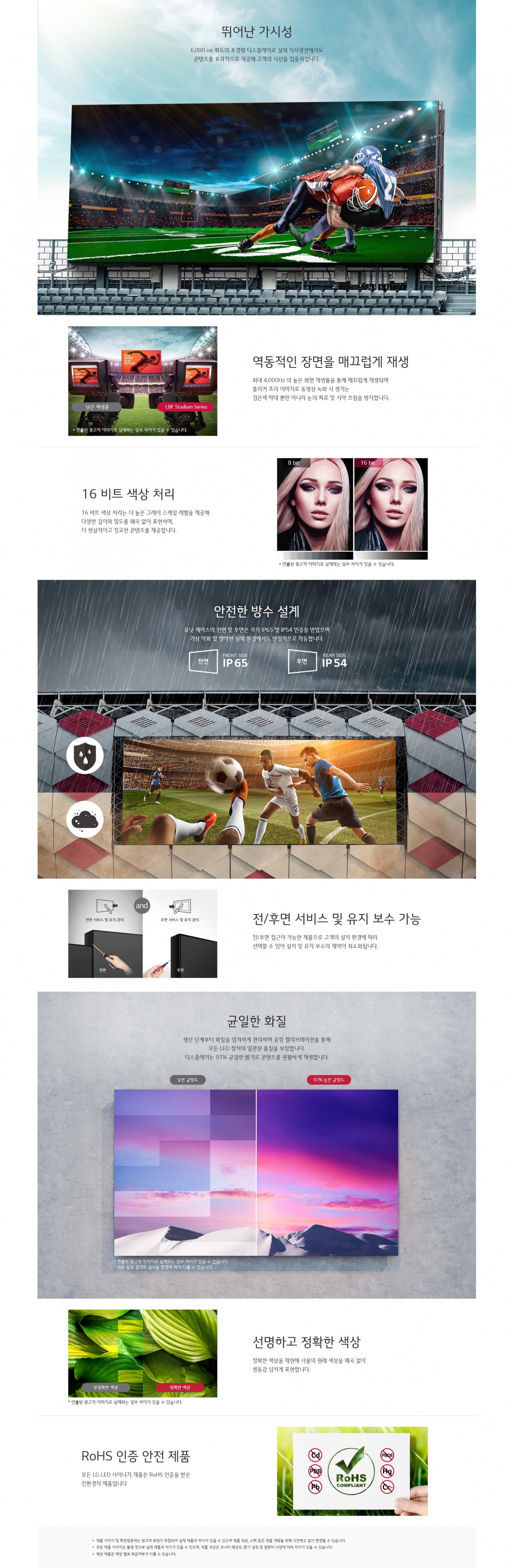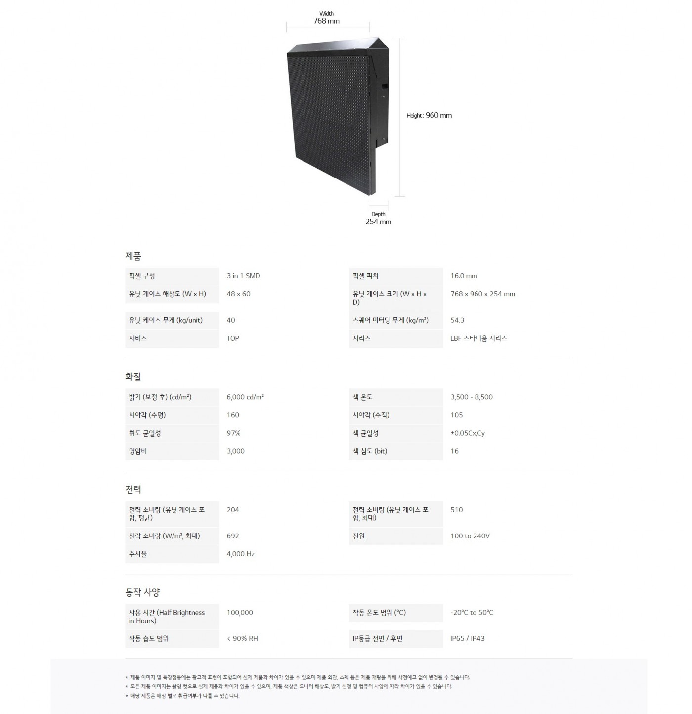 유닛 케이스 크기 (W x H x D) : 768 x 960 x 254 mm밝기 (보정 후) (cd/m²) : 6,000 cd/m²시리즈 : LBF 스타디움 시리즈