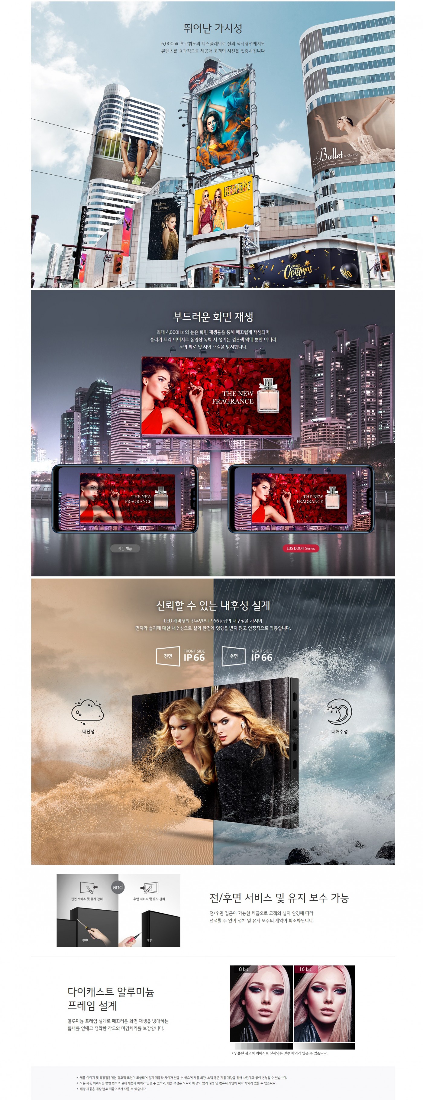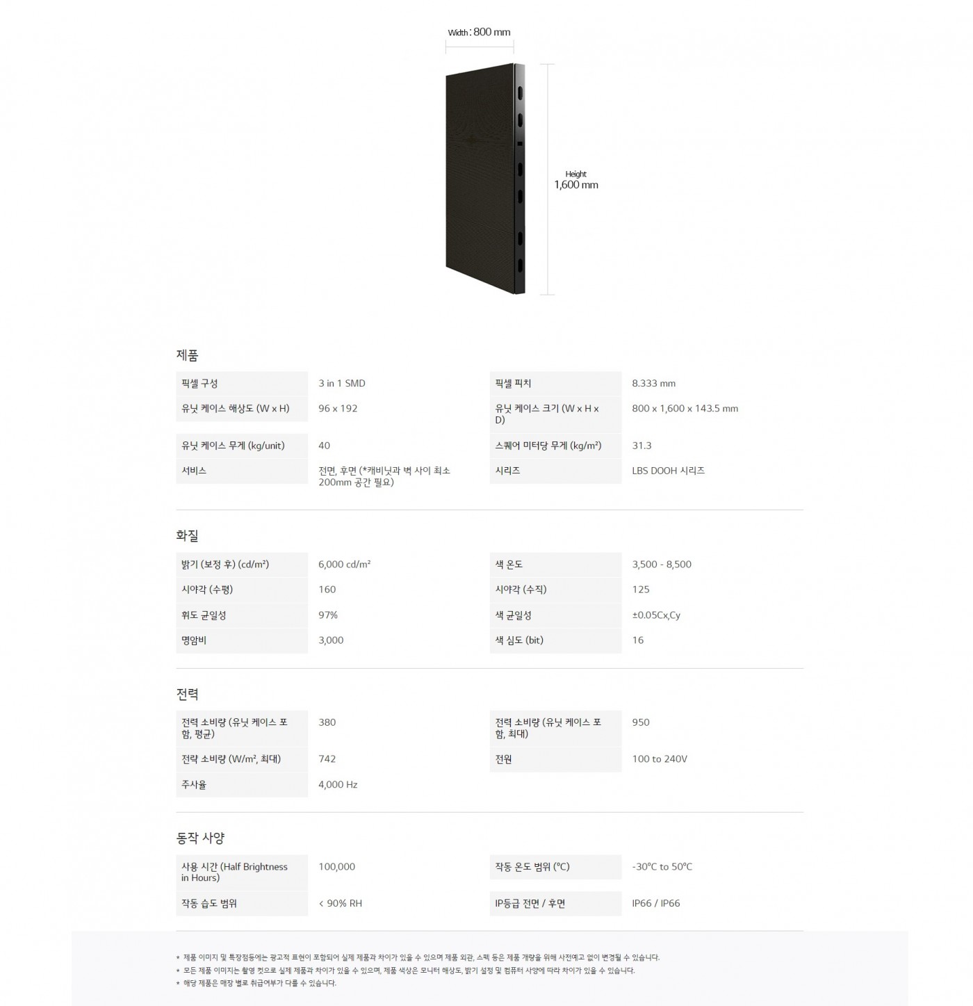 유닛 케이스 크기 (W x H x D) : 800 x 1,600 x 143.5 mm밝기 (보정 후) (cd/m²) : 6,000 cd/m²시리즈 : LBS DOOH 시리즈