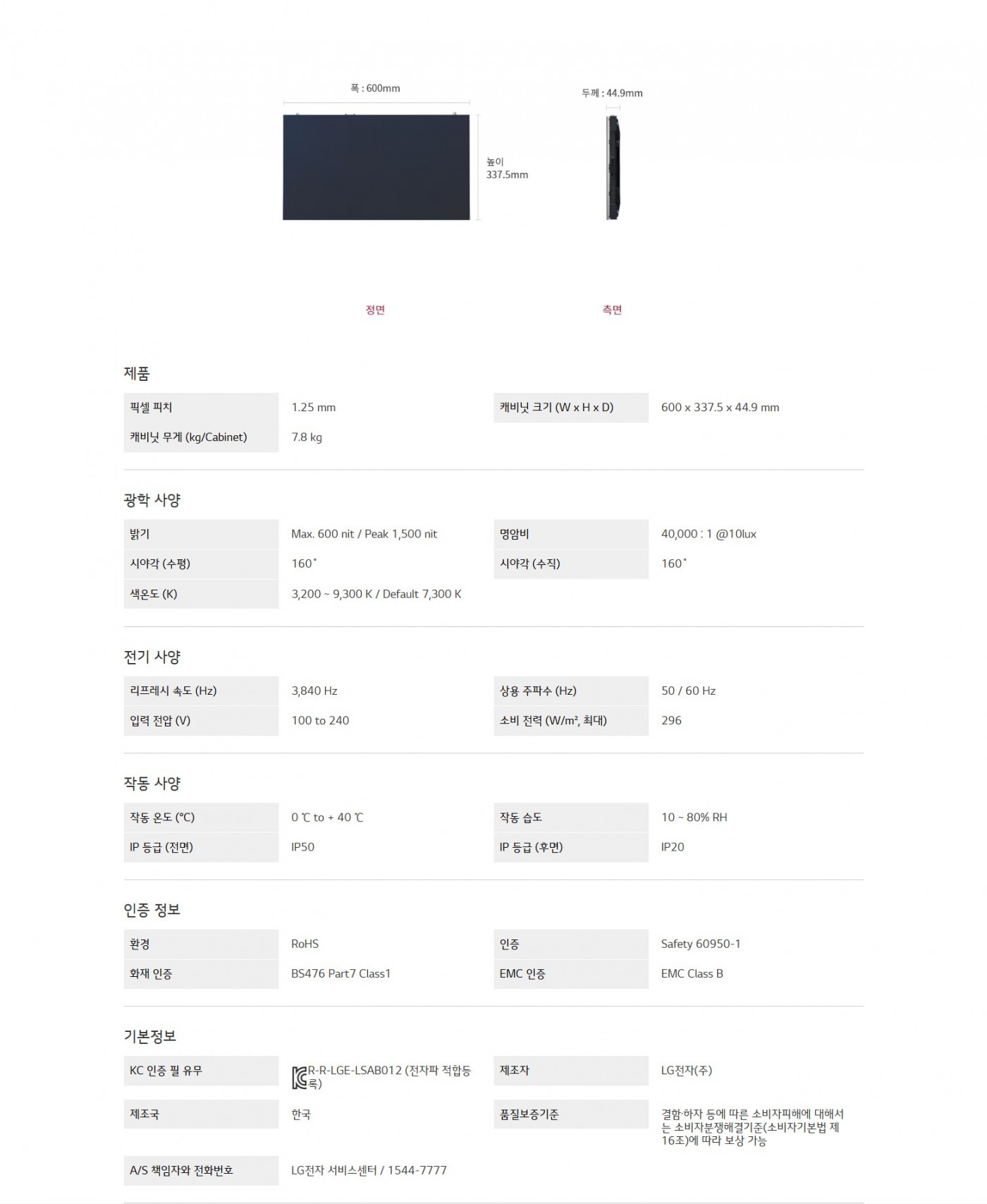캐비닛 크기 (W x H x D) : 600 x 337.5 x 44.9 mm