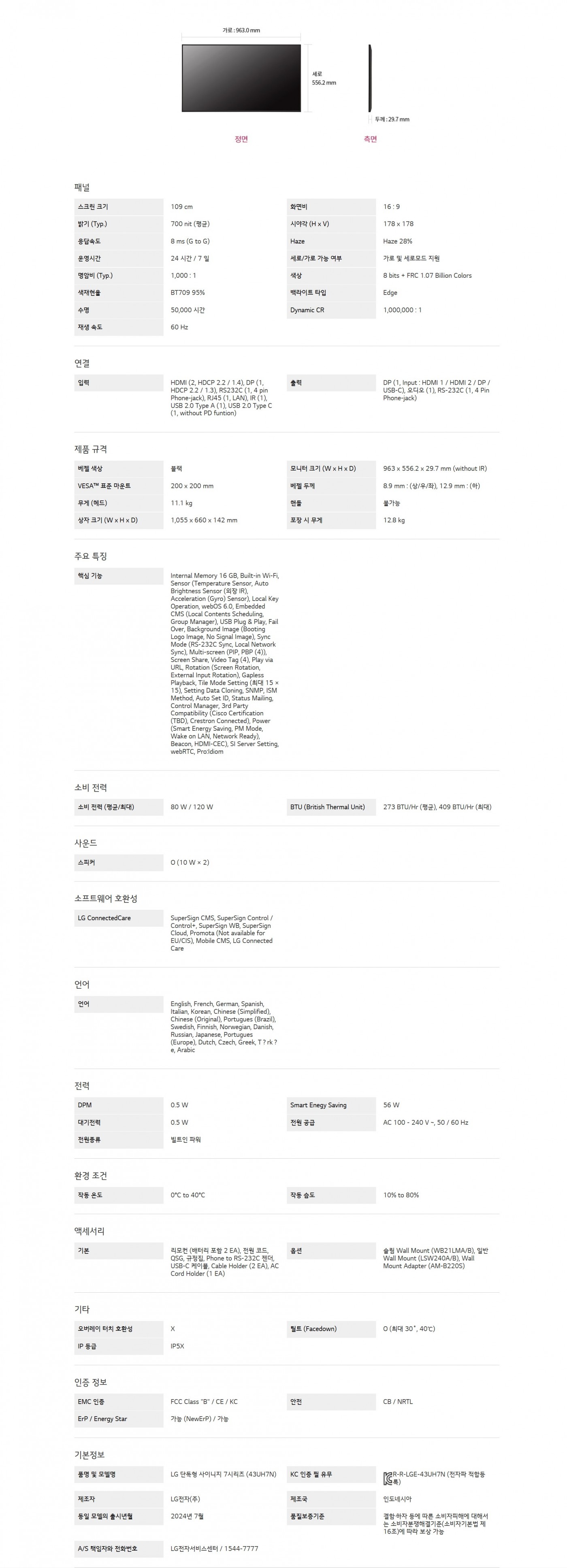 LG 단독형 사이니지 7시리즈 + 벽걸이 브라켓