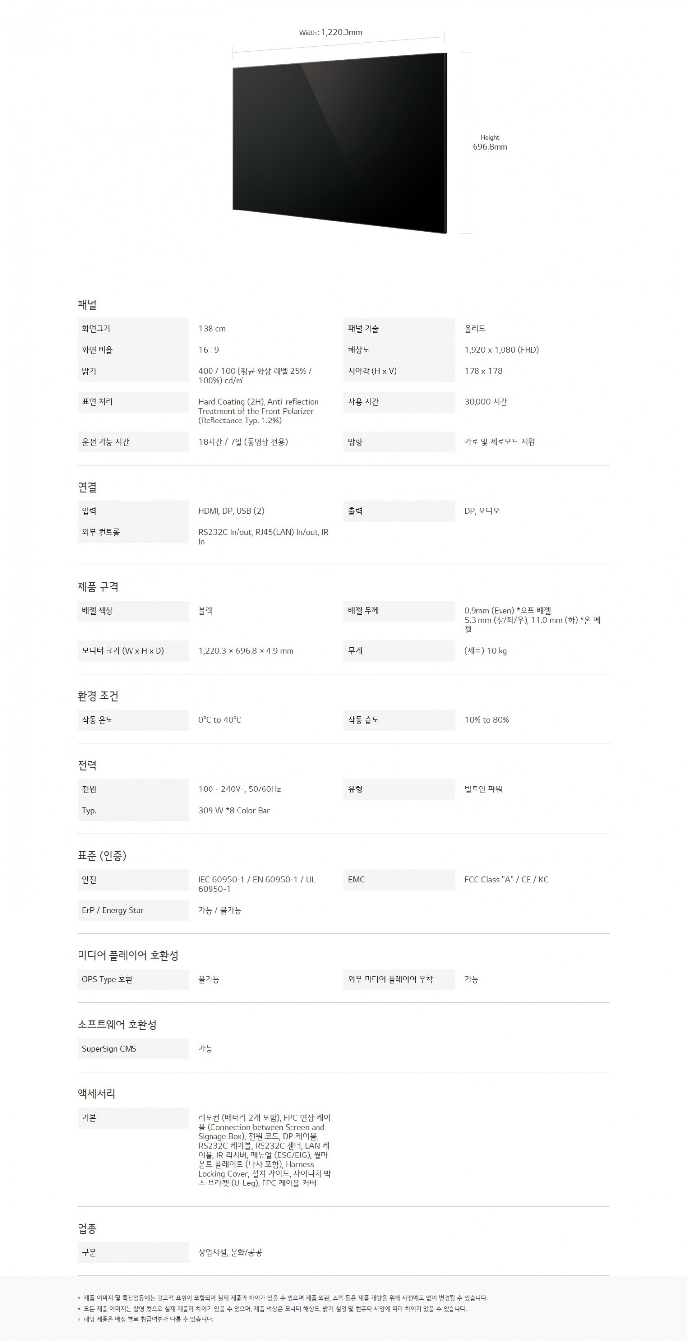 밝기 : 400 / 100 (평균 화상 레벨 25% / 100%) cd/㎡