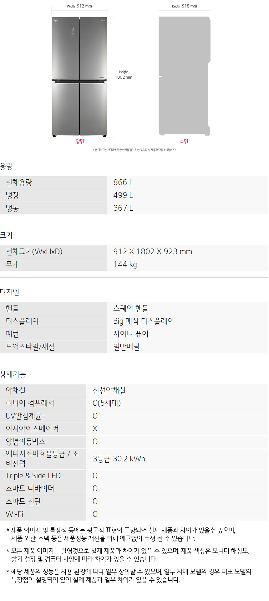 전체용량 : 866 (냉장 : 499 냉동 : 367)패턴 : 샤이니 퓨어 전체크기(WxHxD) : 912 X 1802 X 918 mm