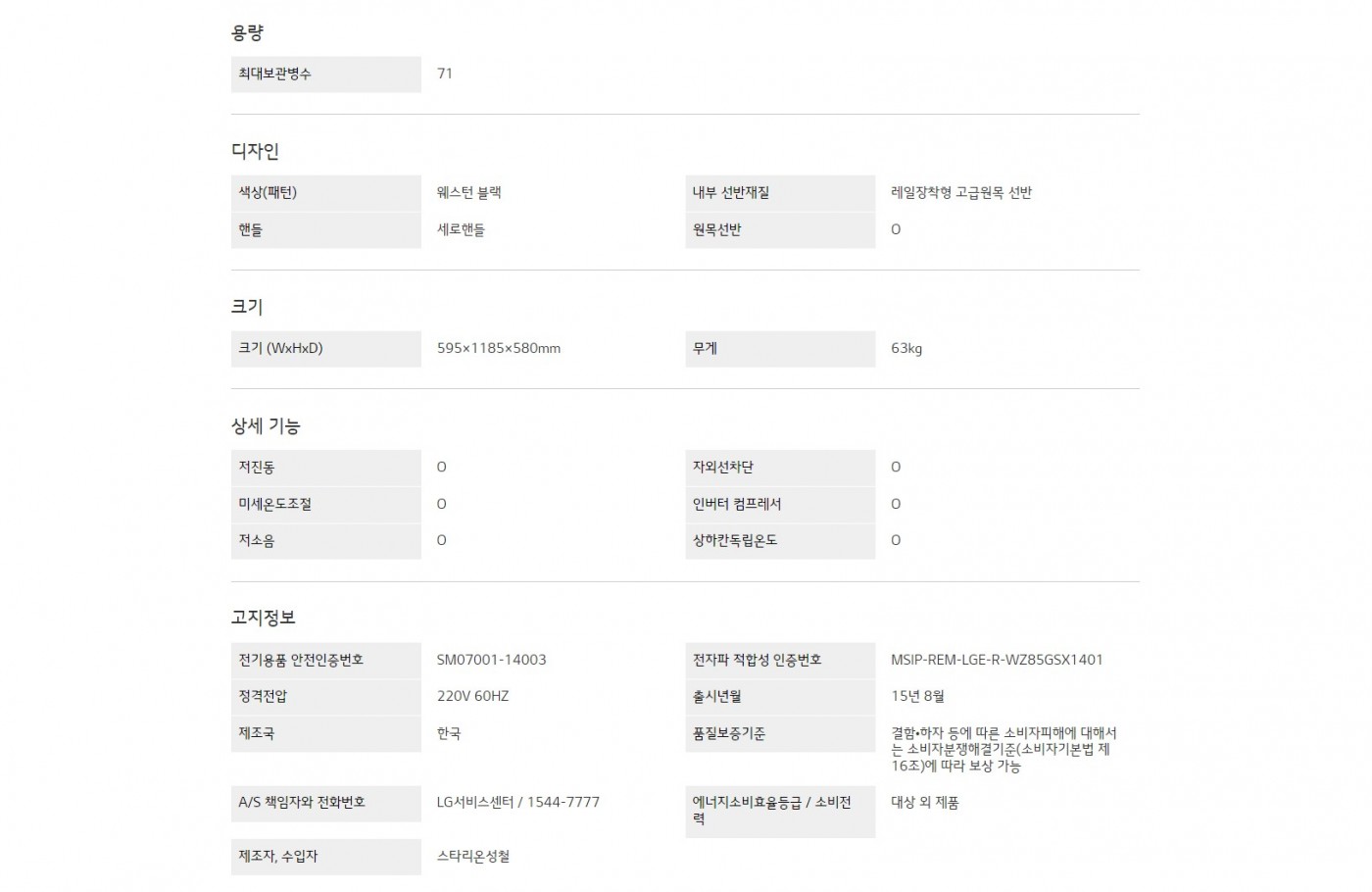 크기 (WxHxD) : 595 x 1,185 x 580 mm