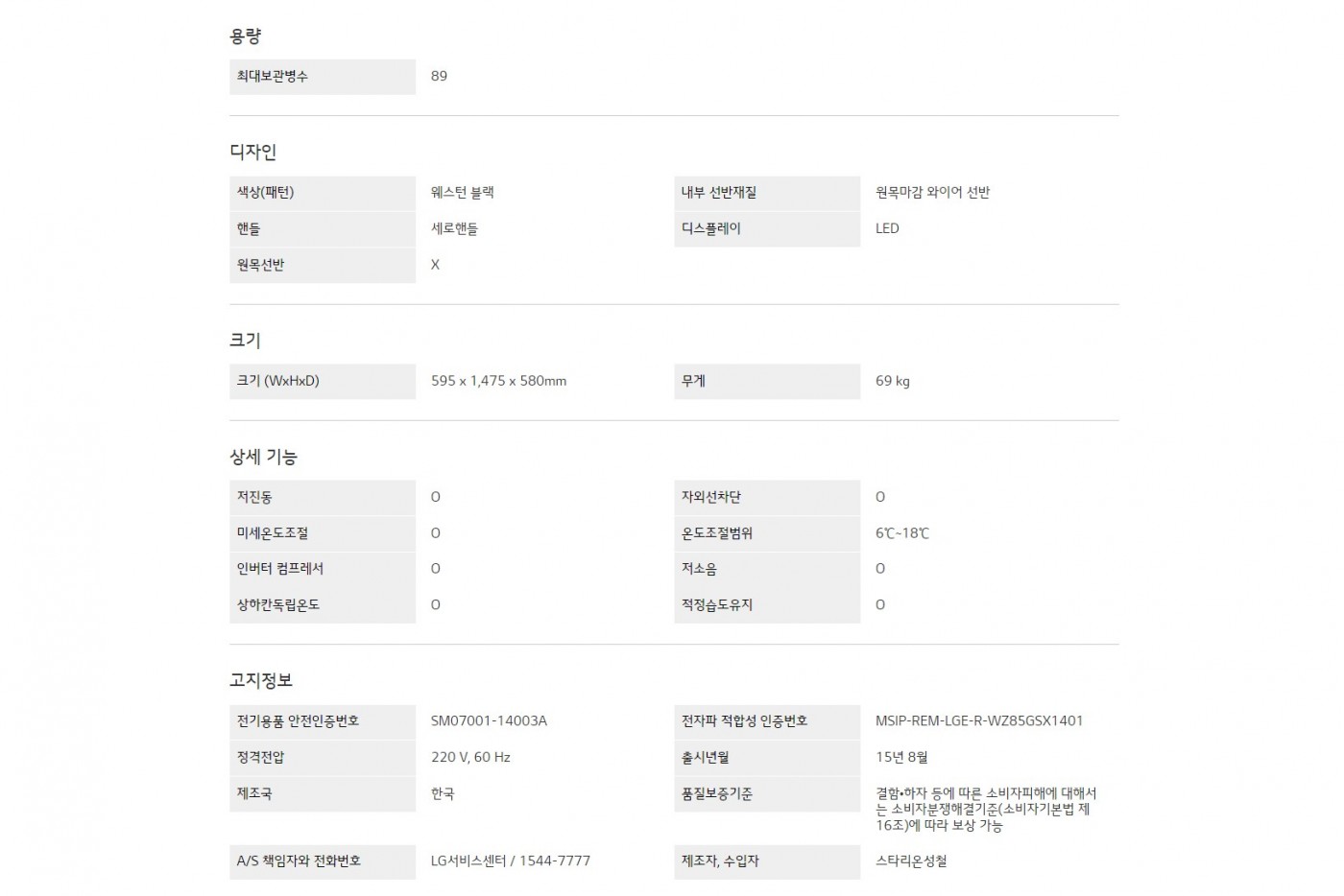 크기 (WxHxD) : 595 x 1,475 x 580 mm
