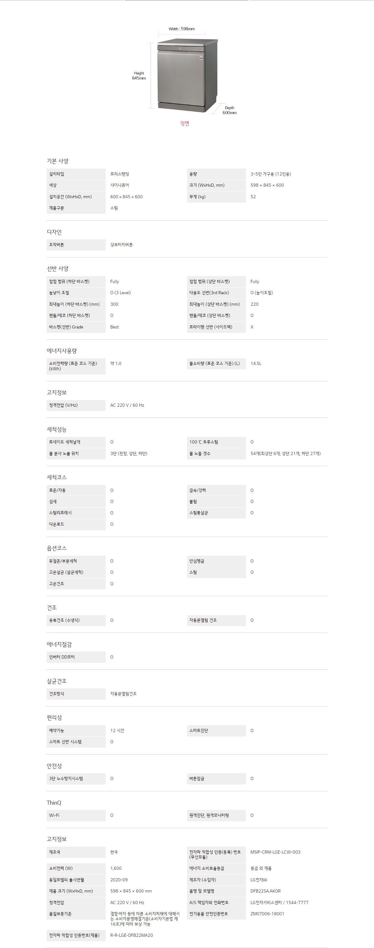 용량 : 3~5인 가구용 (12인용)색상 : 샤이니퓨어크기 (WxHxD) : 598 x 845 x 600mm설치타입 : 프리스탠딩제품구분 : 스팀