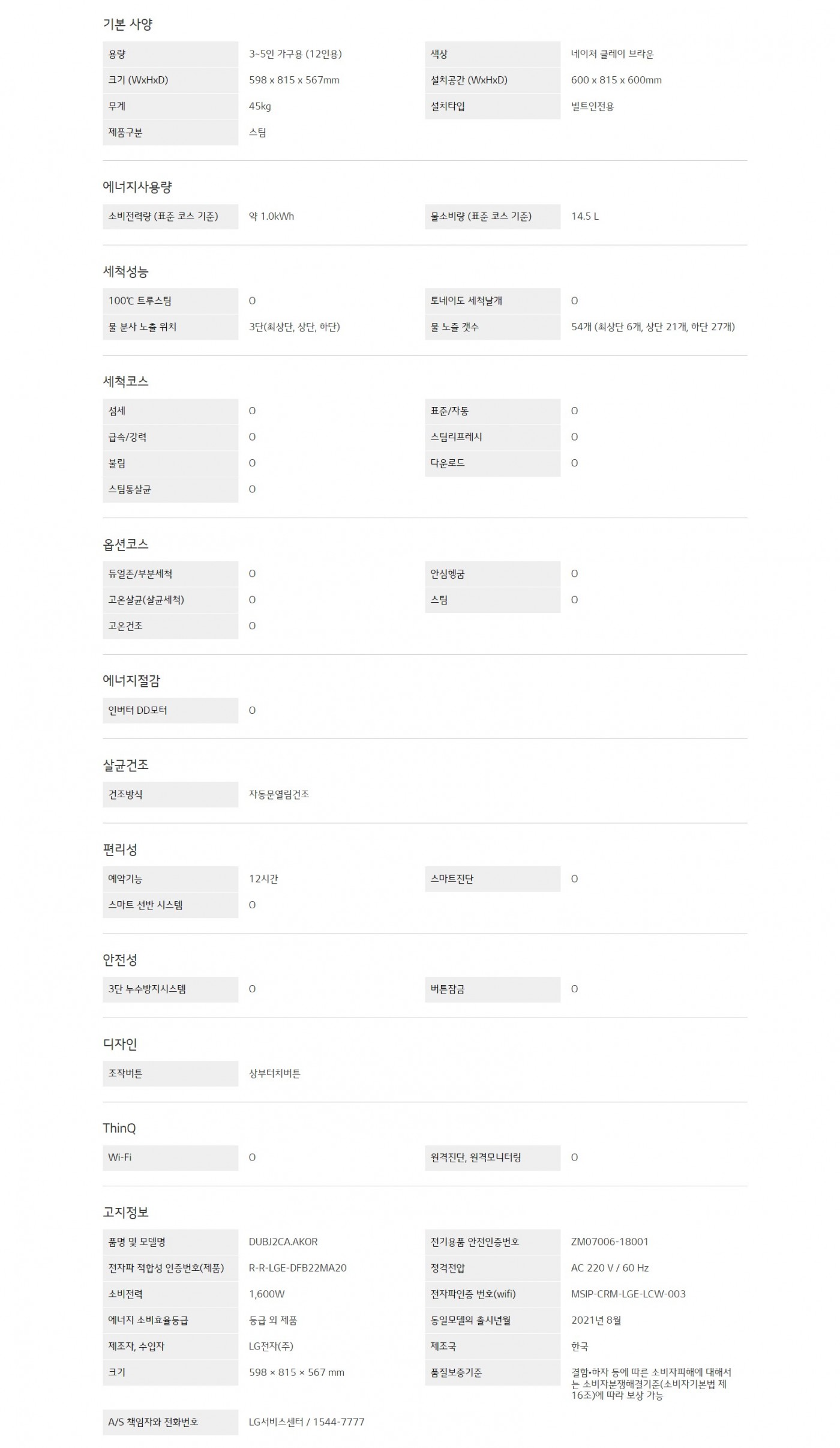용량 : 3~5인 가구용 (12인용)색상 : 네이처 클레이 브라운크기 (WxHxD) : 598 x 815 x 567mm설치타입 : 빌트인전용제품구분 : 스팀