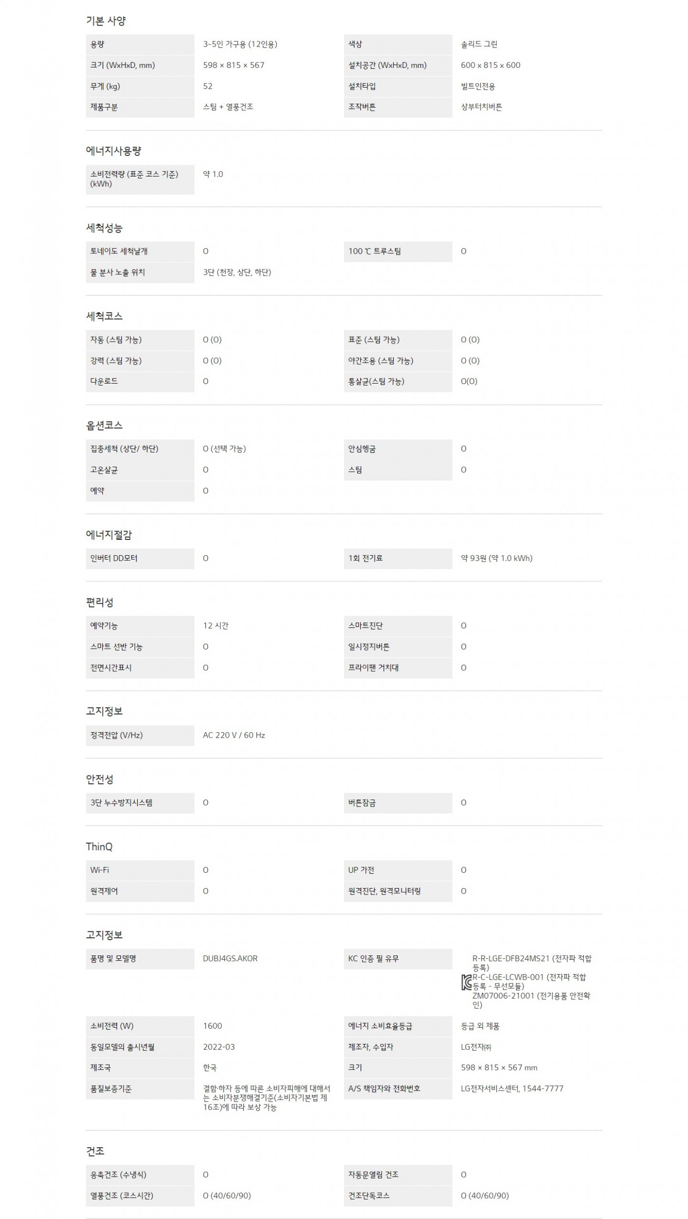 용량 : 3~5인 가구용 (12인용)색상 : 솔리드 그린크기 (WxHxD) : 598 × 815 × 567 mm설치타입 : 빌트인 전용