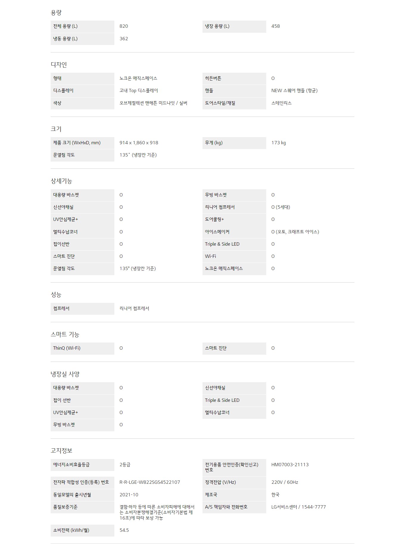 전체 용량(L) : 820