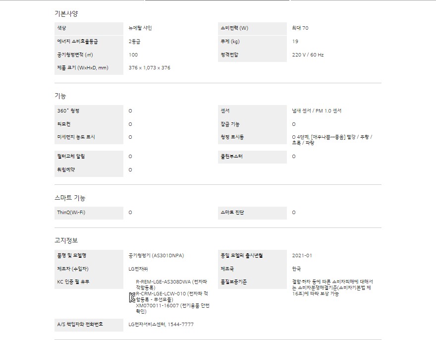 LG 퓨리케어 360˚ 공기청정기 펫 플러스