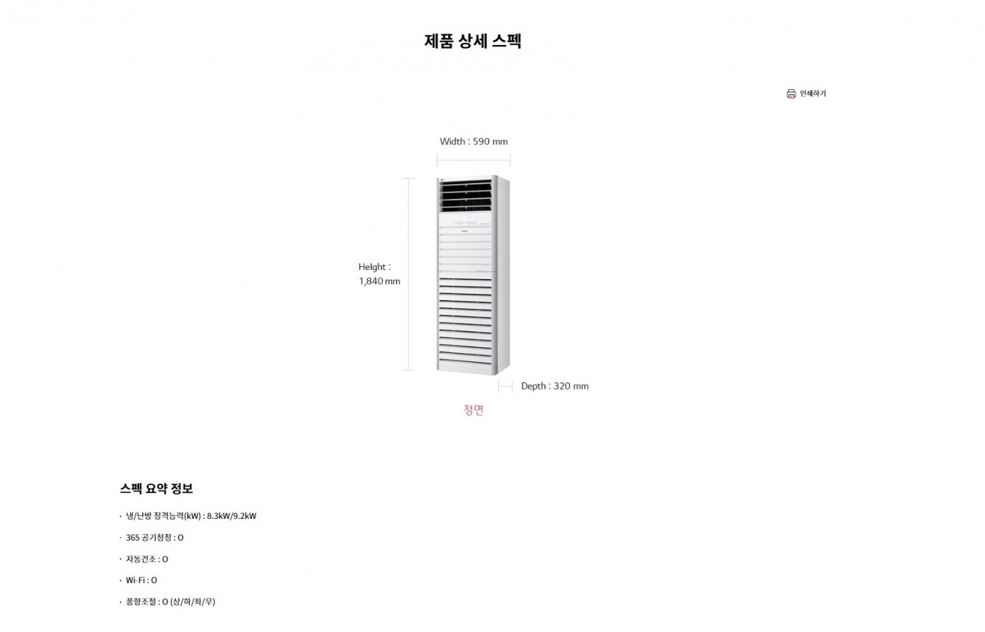 냉/난방 정격능력(kW) : 8.3kW/9.2kW365 공기청정 : O자동건조 : OWi-Fi : O풍향조절 : O (상/하/좌/우)