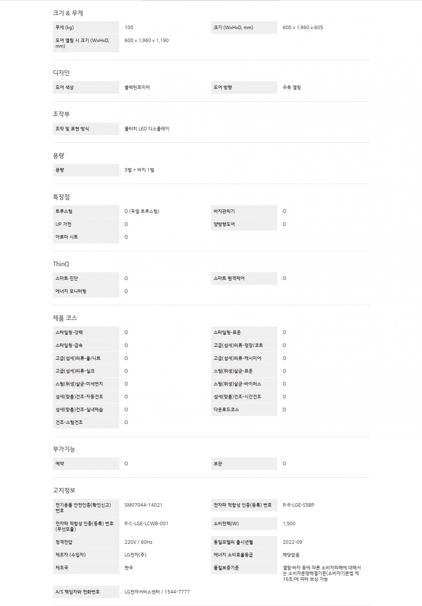 의류 관리에서 건조까지 진짜 스타일러는 스타일러 뿐입니다.크기 (WxHxD, mm) : 600 x 1,960 x 605용량 : 5벌 + 바지 1벌