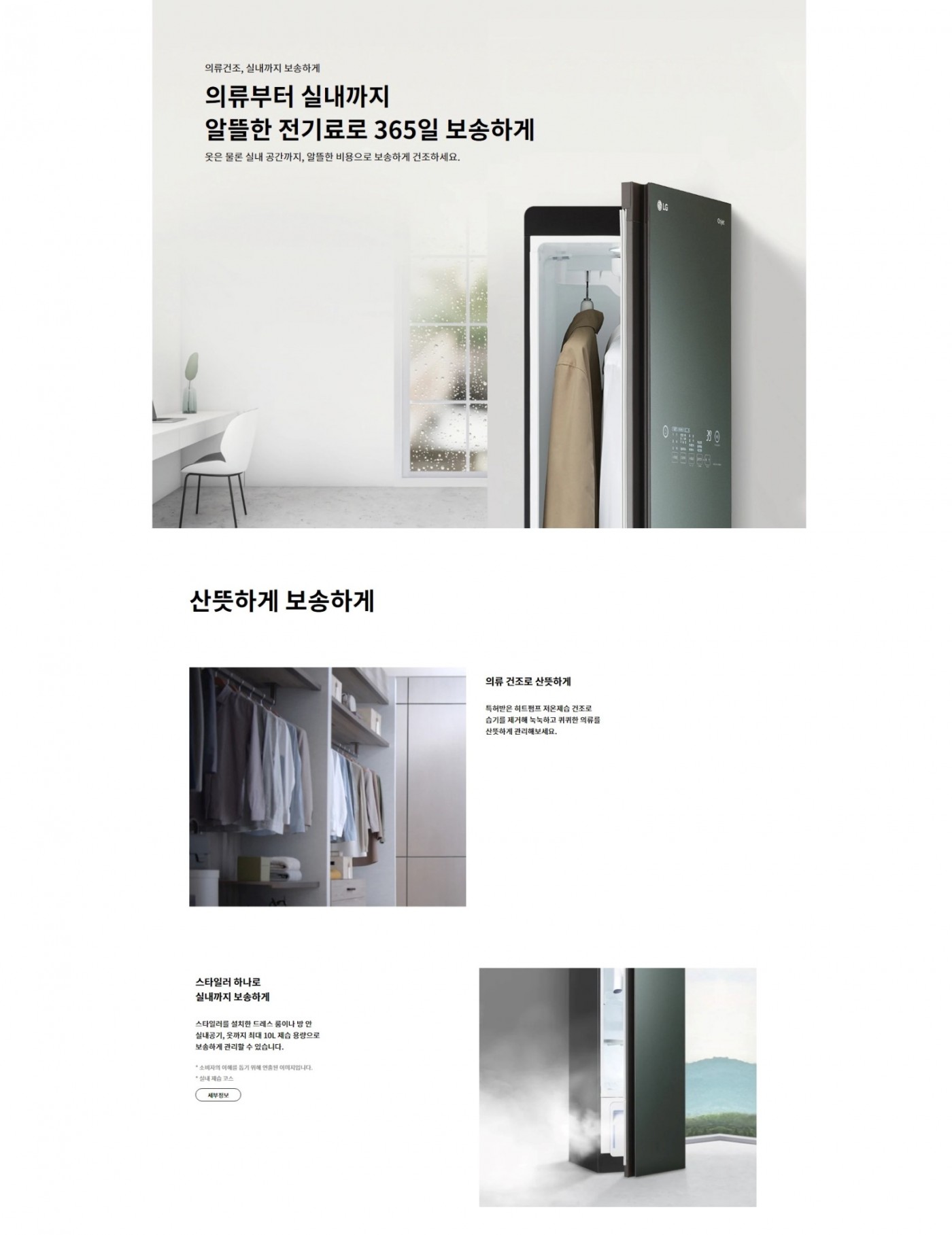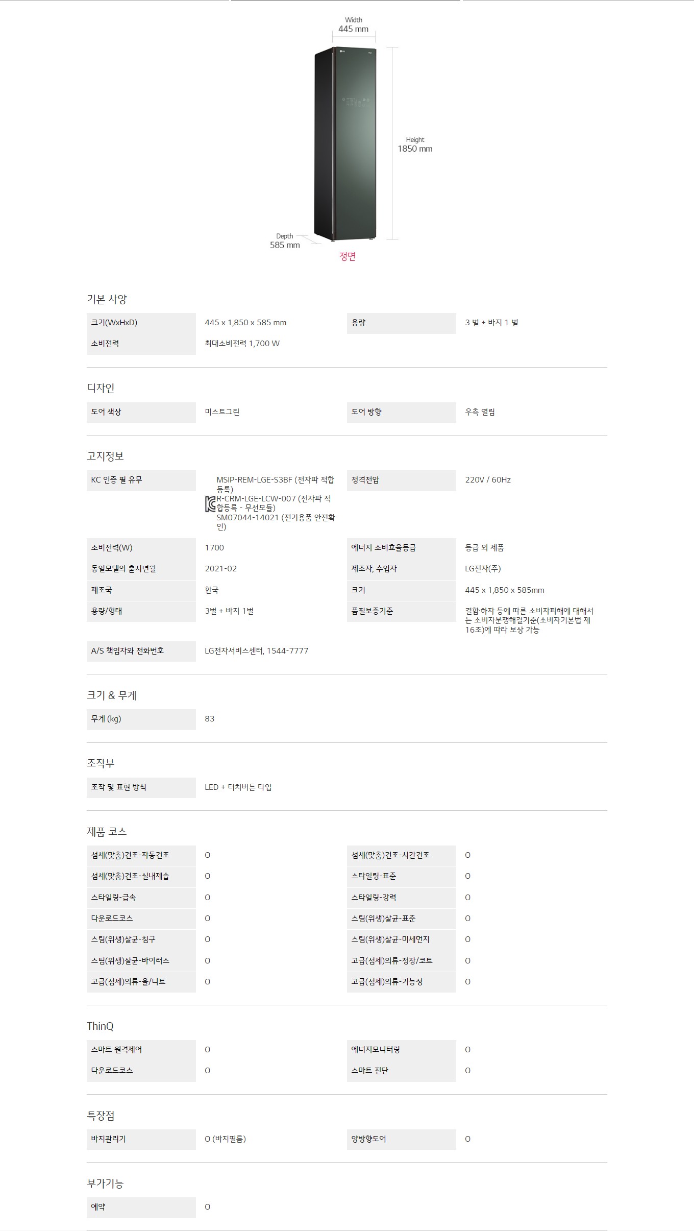 의류 관리에서 건조까지 진짜 스타일러는 스타일러 뿐입니다.크기(WxHxD) : 445 x 1,850 x 585 mm용량 : 3 벌 + 바지 1 벌