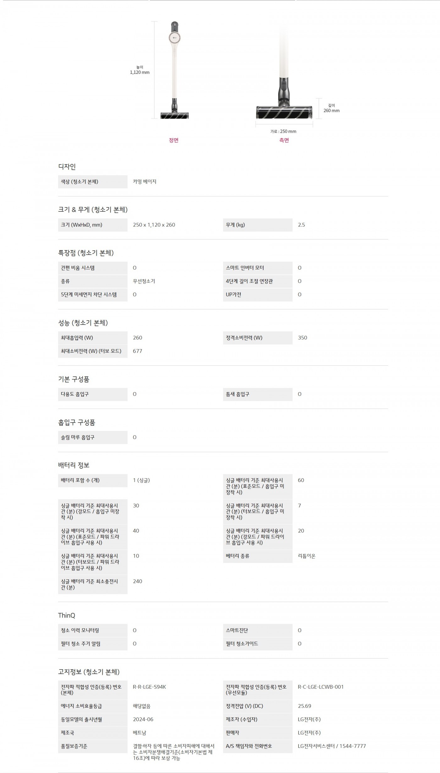 크기 (WxHxD, mm) : 250 x 1,120 x 260