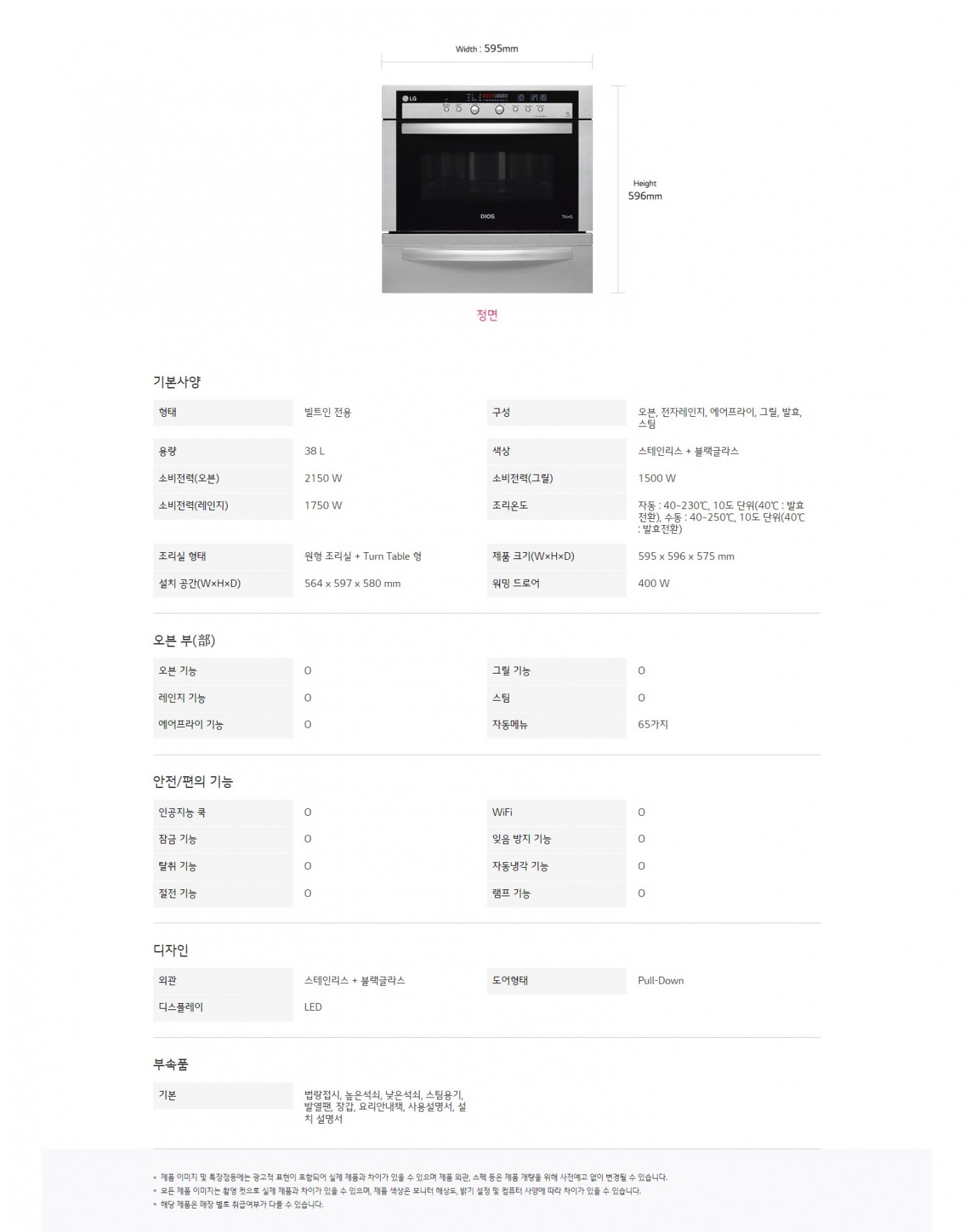 용량 : 38 L색상 : 스테인리스 + 블랙글라스제품 크기(W×H×D) : 595 x 596 x 575 mm설치 공간(W×H×D) : 564 x 597 x 580 mm