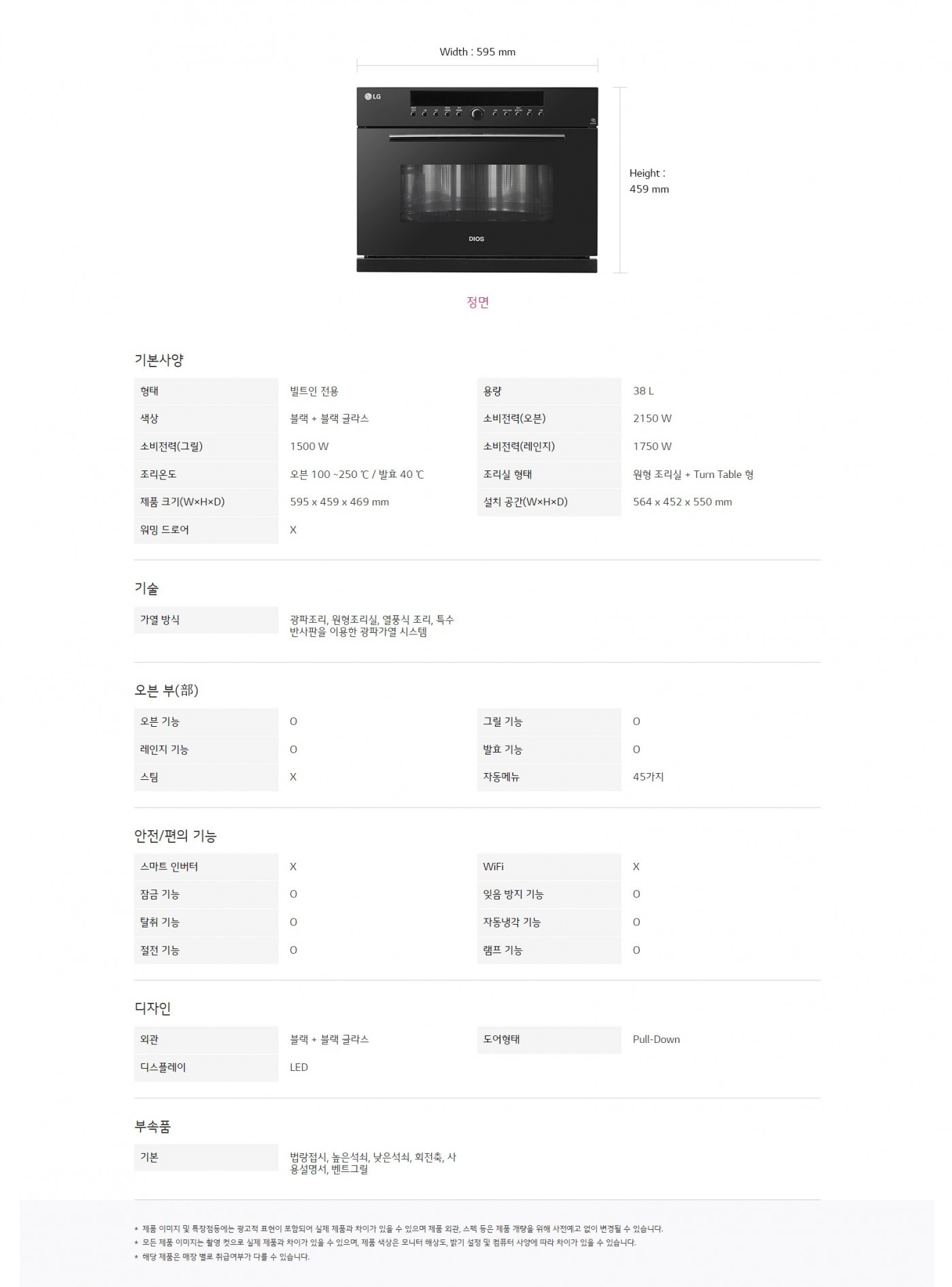 용량 : 38 L색상 : 블랙 + 블랙 글라스제품 크기(W×H×D) : 595 x 459 x 469 mm설치 공간(W×H×D) : 564 x 452 x 550 mm